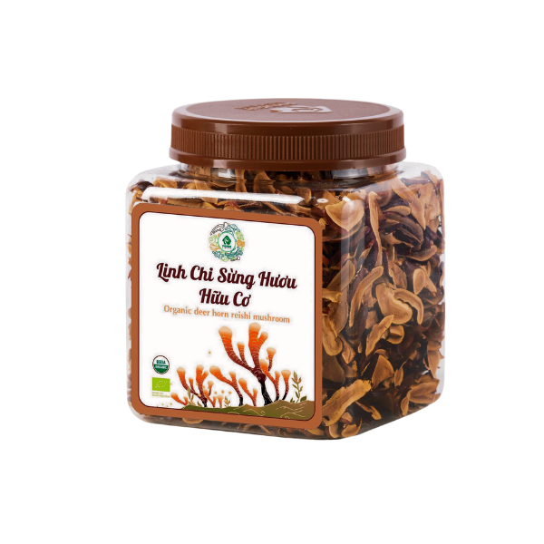 – Nấm Linh Chi Sừng Hươu Hữu Cơ có hình dáng giống như sừng con hươu, phần thân màu đỏ nâu đậm, phần đầu nấm có màu nâu vàng hoặc vàng sáng. Nấm Linh Chi Sừng Hươu Hữu Cơ có một hương thơm rất đặc trưng, nhất là khi được nuôi trồng, thu hoạch và sấy khô tiêu chuẩn.